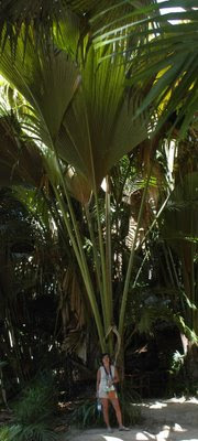 Palmera dioica, posee la semilla mas grande de todo el reino vegetal, que tarda en madurar en rama alrededor de 7 años, suele pesar alrededor de 20 Kilos, aunque las hay con mas de 30, y evidentemente están ahí para generar esas enormes hojas iniciales que deben abrirse a la luz en lucha con sus vecinas, con un pecíolo de hasta 7 metros de altura y un limbo de 4 ó 5 metros de largo por 3 de ancho… ¡ impresionante!.