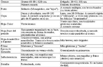 Con un breve entrenamiento es posible reconocer las dos especies de una simple mirada. En la tabla anexa se presenta una serie de caracteres diferenciales para el reconocimiento. Simplificando, la canaria es más robusta, más verde y más frondosa. La datilera doméstica es más “de desierto”, más delgada, su copa es más grisácea o azulada y produce los verdaderos dátiles. El ojo experto distingue incluso las plántulas desde su segundo año de edad por el aspecto más rígido y grisáceo de las datileras domésticas, cuyas hojas juveniles además suelen tener puntas piconas en todos sus segmentos.